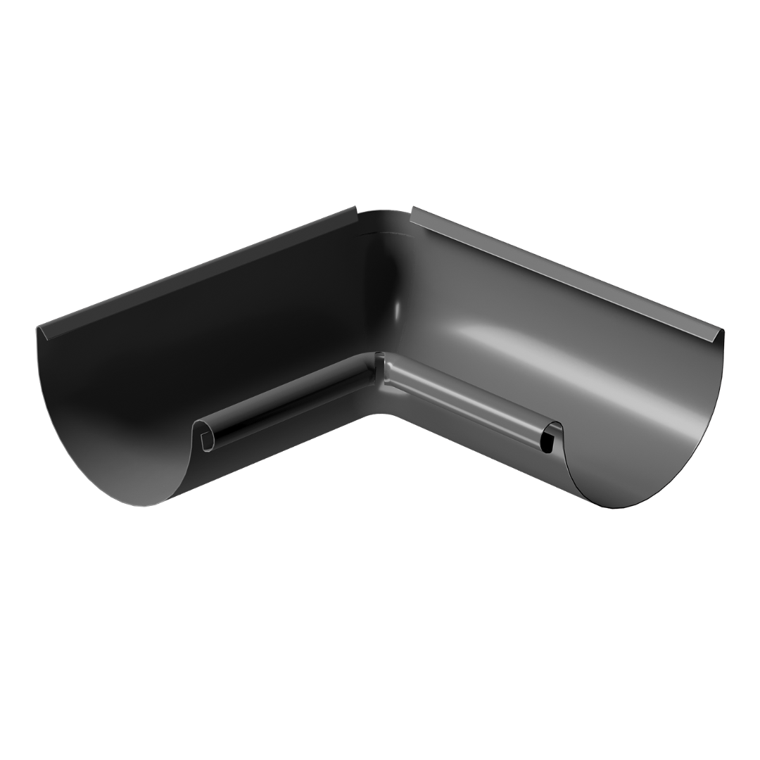 Два соседствующих желоба на внутреннем угле дома можно соединить под прямым углом с помощью изделия — внутренний угол желоба 90˚. Данный элемент может быть окрашен в тон остальным частям водостока «Stal Premium» в один из четырех цветов, среди которых универсальный оттенок серого «Графит».