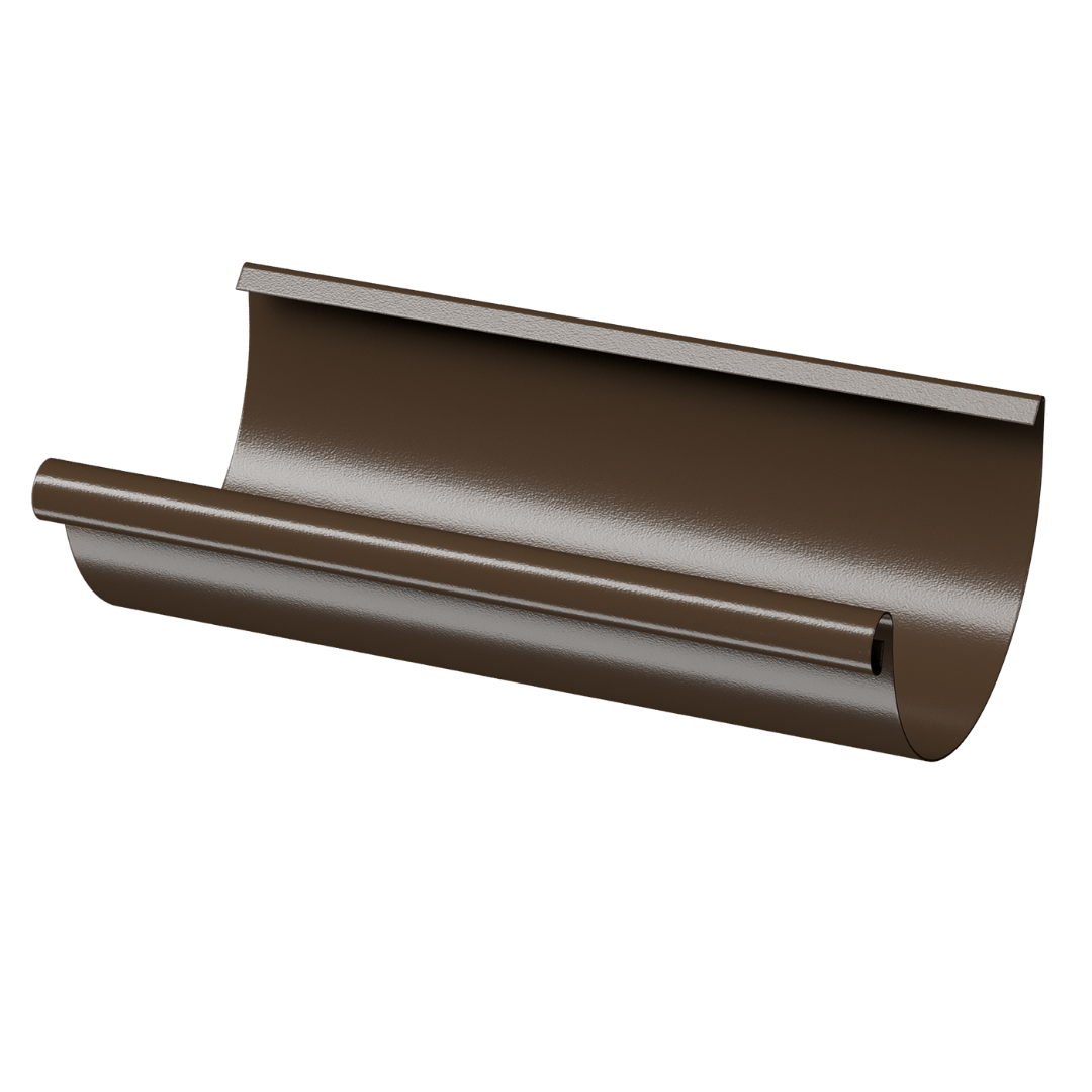 В желобах собирается вода, стекающая с крыши, и направляется далее по водостоку в дренажную систему. Металлический водосточный желоб полукруглый представлен в одном виде длины — 3 метра, и в 4 вариантах расцветки, включая оттенок коричневого «Каштан».